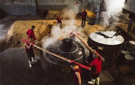 走进水井坊博物馆,就像步入一座“活着的酿酒坊”——漫步在遗迹厅中,仿佛还能感受到古窖池的“呼吸”,在技艺厅里,曾经蒸汽氤氲的酒作坊,还有工匠翻动着发酵的糟醅,竹耙与甑锅碰撞的痕迹。