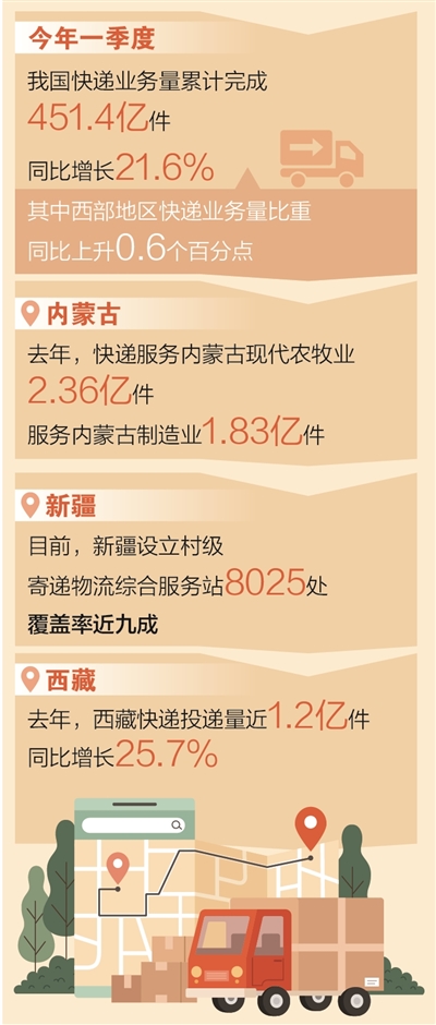 今年一季度,我国快递业务量累计完成451.4亿件,同比增长21.6%,其中西部地区快递业务量比重同比上升0.6个百分点。西部地区加速跻身“包邮区”行列,小包裹正写出崭新的“西邮记”。