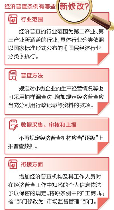 首先,完善有关经济普查行业范围的规定。修改后的《条例》对经济普查的行业范围不再具体列举,表述为:“经济普查的行业范围为第二产业、第三产业所涵盖的行业,具体行业分类依照以国家标准形式公布的《国民经济行业分类》执行。”