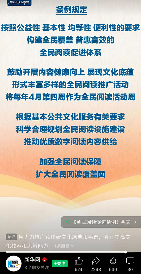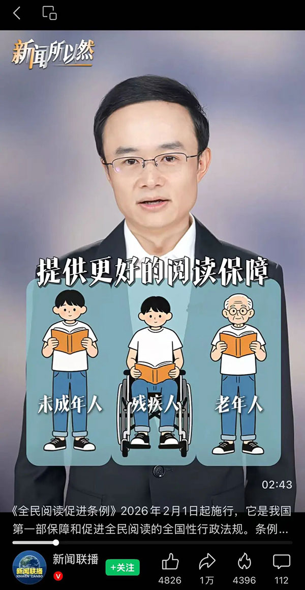 为深入推进全民阅读、建设社会主义文化强国,党的十八大以来,“全民阅读”连续写入政府工作报告,党的二十大进一步提出“深化全民阅读活动”。在此背景下,国务院制定并公布的《全民阅读促进条例》,将于2026年2月1日起施行。该条例是我国首部专门规范全民阅读工作的行政法规,标志着全民阅读工作从政策倡导向法治保障转变。(文字来源:北京发布公众号)