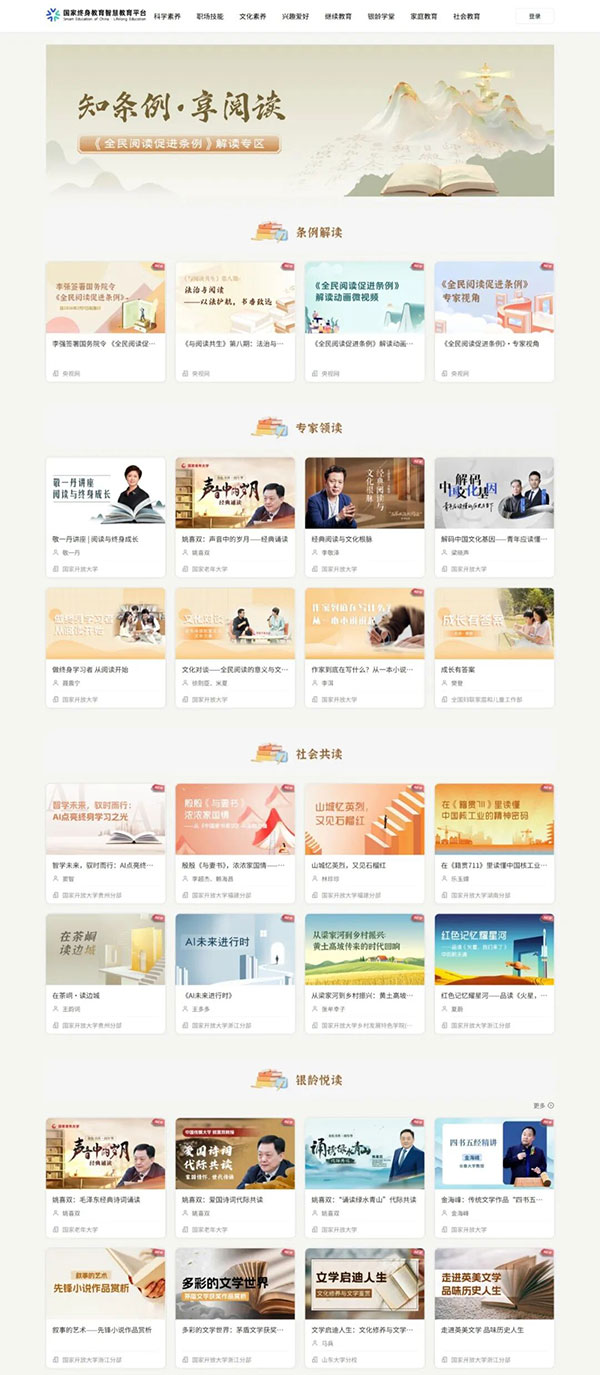 为深入贯彻落实“全民阅读”影响力,持续推动相关工作走深走实,积极营造“爱读书、读好书、善读书”的浓厚氛围,国家终身教育智慧教育平台特别开设“知条例·享阅读”《全民阅读促进条例》解读活动专区,围绕“条例解读”“专家领读”“社会共读”“银龄悦读”四大栏目,打造覆盖全龄段的共读空间。