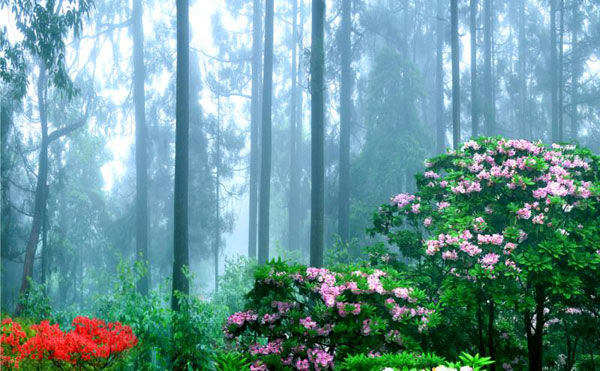 天台山云锦杜鹃:东晋孙绰在《游天台山赋》中赞美天台山“八桂森挺以凌霜,五芝含秀而晨敷……建木灭景於千寻,琪树璀璨而垂珠”,良好的生态环境和人为积极保护,使天台山许多的古木名花繁衍至今,华顶国家森林公园境内的云锦杜鹃就是其中树姿优美、花色娇艳的名花。