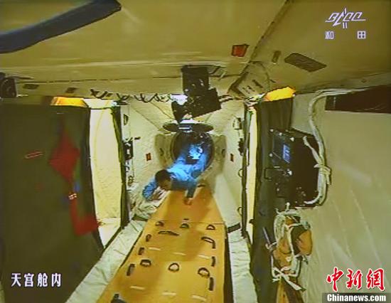 图为在张晓光的协助下,聂海胜顺利开启并进入天宫一号舱门(资料图)。中新社发 秦宪安 摄