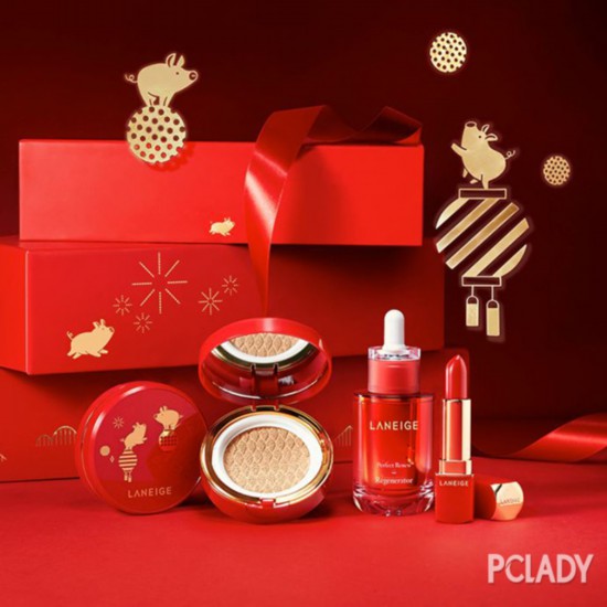 金猪搭配中国红,为迷人的你点缀新年鸿运,将肌肤从冬季中唤醒,带来水光透亮。兰芝鸿运限量版特选三款深受中国消费者喜爱的兰芝明星单品,包括:兰芝凝润柔光气垫霜、兰芝全新绝色丝润唇膏、兰芝致美紧颜修护精华液。在新的一年,带来专属中国女性兼具无瑕与水润通透的闪耀光彩美肌!