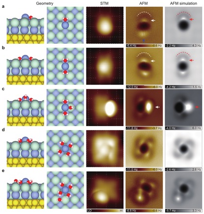 钠离子水合物的亚分子级分辨成像。从左至右,依次为五种离子水合物的原子结构图、扫描隧道显微镜图、原子力显微镜图和原子力成像模拟图。图像尺寸:1.5 nm ×1.5 nm。