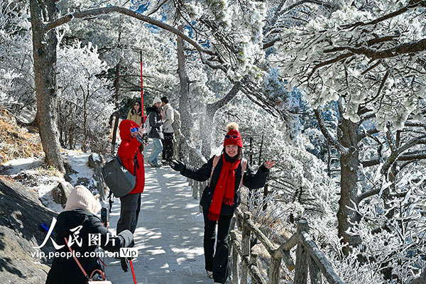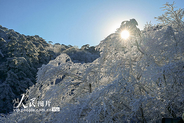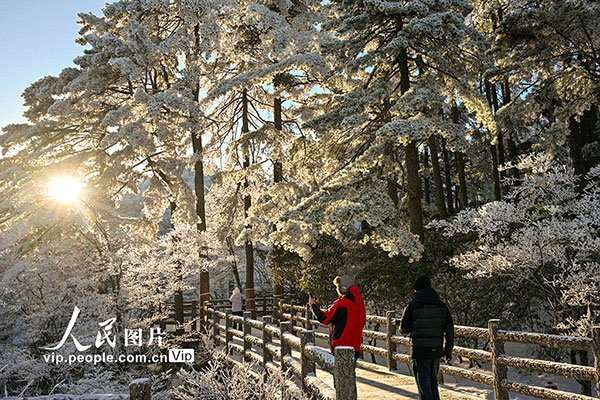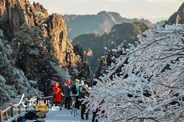 2026年1月7日,安徽黄山风景区迎来新年首场雾凇景观,漫山银装,玉树琼枝,晶莹的冰晶缀满松梢,吸引游客观赏拍摄。水从泽摄(人民图片网)