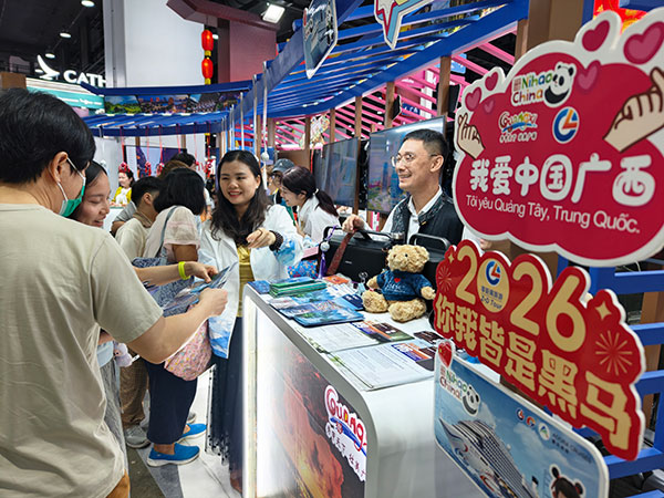 本次广西展台以“壮美广西 秀甲天下”为主题,通过图片和视频循环展示广西文旅资源,辅以绣球、壮锦等装饰,营造广西自然风光和民族风情融合之美。现场摆放的泰语版广西文旅宣传册、多语种广西离境退税综合指南及精品旅游线路手册等,吸引了大量游客驻足问询,多家国际旅行商与参展企业进行洽谈对接。