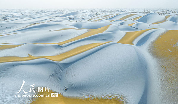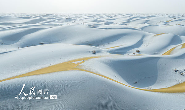 2026年1月29日,新疆巴音郭楞蒙古自治州尉犁县塔克拉玛干沙漠边缘迎来降雪。皑皑白雪覆盖下的沙海,静谧而壮美。汪志鹏摄(人民图片网)