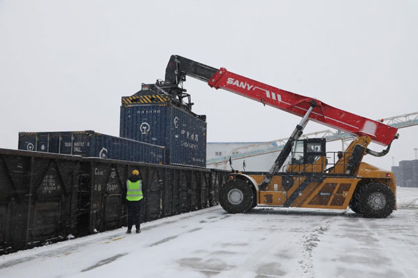 铁路运销公司年运输量达到780万吨,承担着园区铝锭,煤炭、大宗原辅材料的运输职能,占据着重要地位。来到铁路运输集装箱站台,冰天雪地中工人们正在紧张有序地进行集装箱装车作业。正面吊司机在两名安全防护人员的指挥下将装满铝锭的一列列集装箱吊运至火车车厢。“一箱装32吨铝锭,一节车一组(两箱)约装64吨,一列车53节左右,约装3392吨,我们月均发运量为2.6万吨。”运输部副主任张斯彤介绍到。