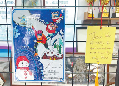 得知学校冰球馆为亚冬会服务,学生们十分开心。冰壶馆的运动员通道旁,装点着孩子们手工制作的板报、图画,充满了童趣。凑近一看,这里还有各代表团运动员的留言,充满温情。其中一条用歪歪扭扭的汉字写着对孩子们的回应:“谢谢你的画!希望你能爱上冰雪运动,祝你健康成长。”