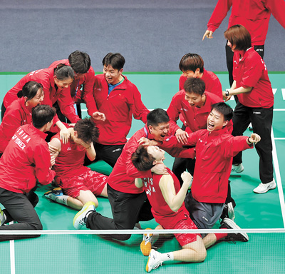 当女双组合刘圣书/谭宁合力为中国队拿下制胜一分,她们激动地振臂欢呼,与冲进场地的队友们围成一圈,相拥庆祝。5月4日,在福建厦门凤凰体育馆上万名观众的见证下,中国羽毛球队以3∶1战胜韩国队,连续第四次登顶。