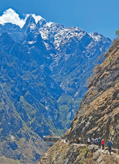 虎跳峡高路徒步线路被誉为“世界十大经典徒步线路之一”。“虎跳峡的险与美,尤为吸引人。”和建军介绍,沿线还能观赏金沙江和玉龙十三峰的美景。