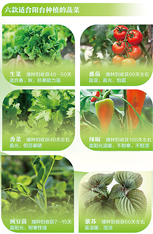 在城市的家中种菜,首先要根据阳台朝向选择适宜的作物。一般来说,南向阳台适合种植绝大多数蔬菜,尤其是黄瓜、番茄等喜温喜光品种;北向阳台可种植一些喜凉、光照要求不高的叶菜类,如生菜、小白菜、芹菜、小葱、香菜等;朝东和朝西阳台的温光环境介于上述两者之间,多数蔬菜种类都可以选择。如果没什么种植经验,建议选择生长较快、管理简单的叶菜类蔬菜。
