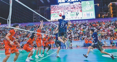 离赛场还有一里地,顺着人潮走,里三层外三层都是球迷。沿街的小吃摊、水果摊前,人头攒动。再往里,终于来到赛事现场。海南省海口市龙桥镇动漫战队配合默契,一记精彩的扣杀落地有声,被观众形容为“椰子砸地”,引发全场欢呼。