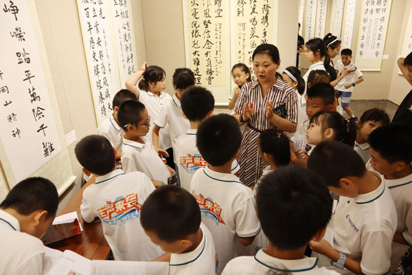 在中华文化促进会美育工作委员会负责人张文婧、办公室主任张路红等老师的带领下,40名小记者和自己喜欢的楹联书法合影留念,向老师请教、与同学讨论,表现出浓厚的兴趣。