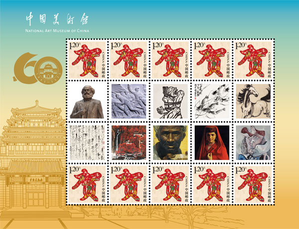 为庆祝中国美术馆建馆60周年,中国邮政发行《中国美术馆》特种邮票1套1枚。在2023年5月23日建馆60周年纪念日当天,隆重的《中国美术馆》特种邮票首发仪式在中国美术馆举行。