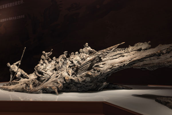 江宽水急,无法架桥,36名艄公义无反顾,深深撑起船桨,将身体后仰至接近锐角的角度,为帮助红军主力抢夺皎平渡争分夺秒。当地农民与红军一心,凭7只小船从容过江,将敌人追兵远远落下两天路程……难忘组雕之《巧渡金沙江》作品中,这“紧紧依靠人民群众,同人民群众生死相依、患难与共、艰苦奋斗”的长征精神!