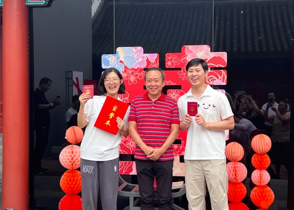 工作人员精心复制,为新人准备承载着厚重历史与美好祝愿的椅子,新人更是开心地打卡拍照,还原姿势,希望能像周恩来与邓颖超那样,共同奋斗、相伴一生。新人办理完登记手续,在现场群众见证下许下“互敬互爱,互信互勉,相濡以沫,钟爱一生”的誓言。随后,周恩来侄外孙、北京大鸾翔宇慈善基金会理事长沈清与新人亲切交流,为新人送上祝福;人民日报出版社原社长刘华新,西城区民政局党组成员、副局长许洋及西城区相关领导与沈清共同为5对新人颁发结婚证。新人们兴奋地分享“倍感幸运与幸福”,“特别有仪式感,感谢这么好的安排”。