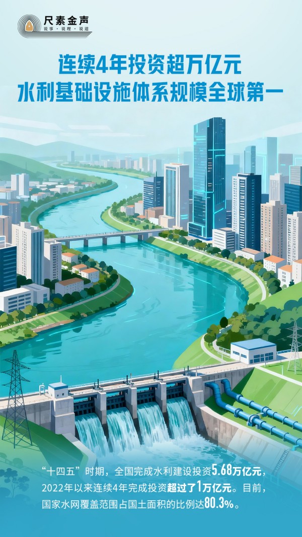 在1月9日国新办举行的新闻发布会上,水利部副部长陈敏介绍,“十四五”时期,全国完成水利建设投资5.68万亿元,2022年以来连续4年完成投资超过了1万亿元。目前,国家水网覆盖范围占国土面积的比例达80.3%,为国家重大战略实施、重要经济区、重要城市群、能源基地、粮食主产区、重点生态功能区、重要水运通道提供了水安全保障。