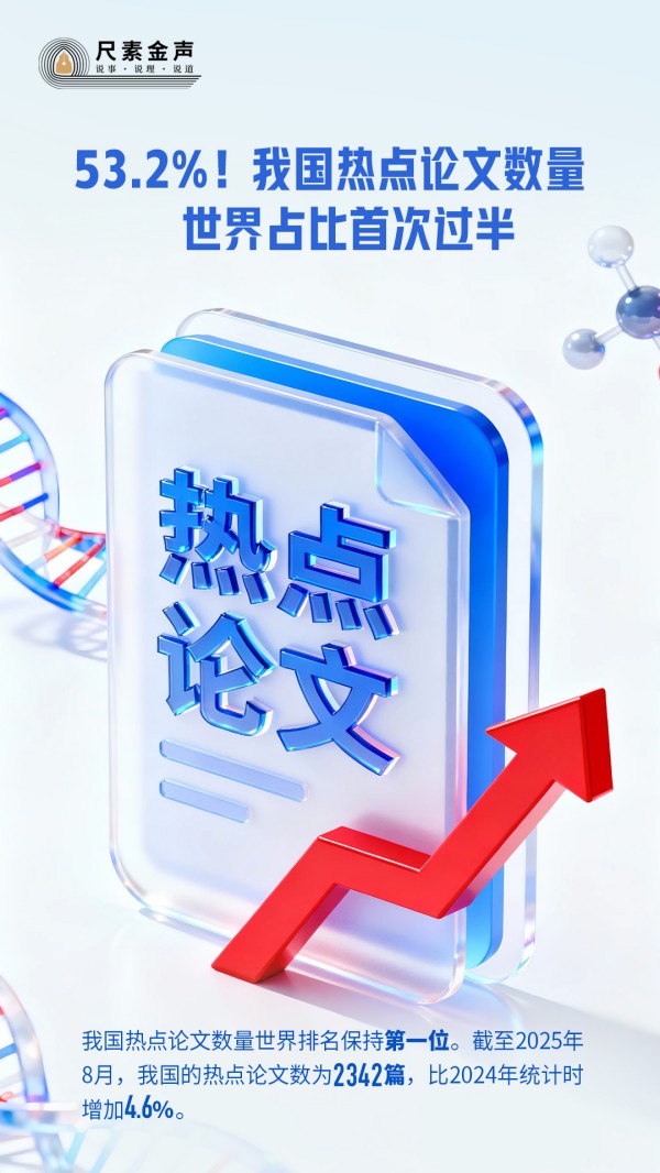 前不久,中国科学技术信息研究所发布的《2025年中国科技论文统计报告》显示:我国热点论文数量世界占比首次过半,达53.2%,世界排名保持第一位。