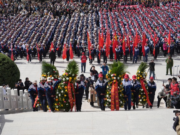 松柏守陵,众人缅怀,庄严肃穆,英魂不朽。