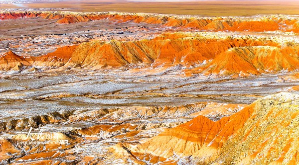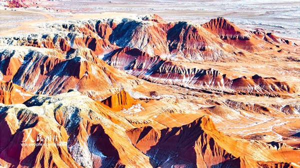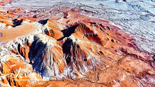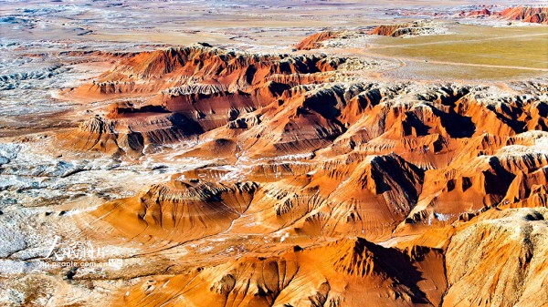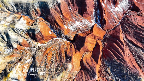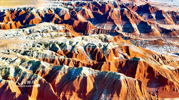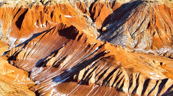 红崖台地位于内蒙古乌兰察布市四子王旗,山体呈现红色,随季节变化深浅交替,为丹霞地貌,南北长约15公里,东西宽约10公里,当地人称“大红山”,是四子王国家地质公园的重要组成部分。隆冬时节,雪色点缀下的红崖台地色彩浓烈,景色壮美。王正摄(人民图片网)