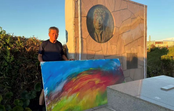 2025年春节,我受朋友邀请,拜访位于鹄沼海岸的聂耳纪念碑。当地政府提前去聂耳广场取下保护纪念碑的透明塑料罩,并在寒风中等候4小时,这份心意令我们无比感动。我忽然想:既然加古先生能让《义勇军进行曲》的旋律飘扬于长城之上历史的天空,我何不也将它化作一幅音乐绘画?