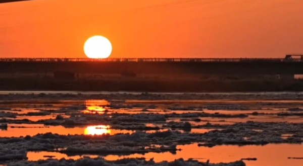 河水在渐渐变暗的天空中做着最后的反抗。它加快了流动速度,好让流凌结得慢些。可温度还在下降,能看到几块大流凌已经挡在碎琉璃的前面。那光滑的冰面、厚重的冰层,在太阳红光的透照下更显清澈。岸边积着一些大大小小的流凌,在夕阳光晕的点缀下红得剔透。