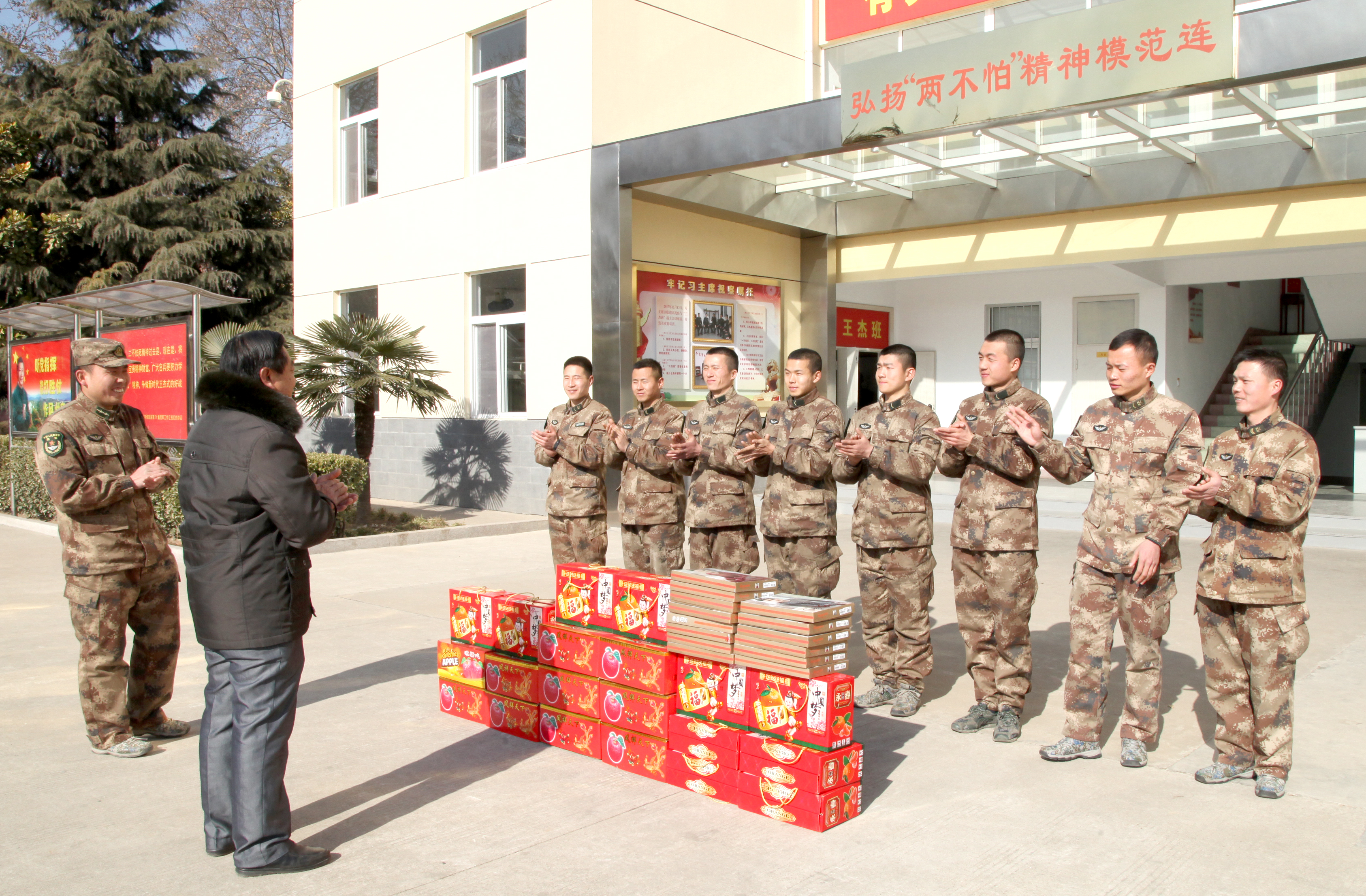 1月3日,全国拥军模范、中国公益慈善形象大使、徐州市关心国防十佳公民、王杰精神研究会会长汪春恩携邳州市王杰中学校长宋端凯带着书籍、御寒保暖内衣、苹果、橘子等春节慰问品和邳州190万人民对子弟兵的深情厚谊及新春的祝福来到徐州71集团军王杰部队.