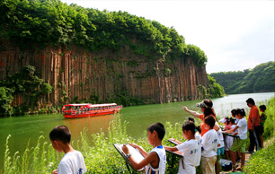 黄椅山火山大峡谷漂流全长4公里,河面宽阔处达百米。水质清澈,水流湍急,河两岸绿树掩映,火山岩隐于树荫,山水相映,景象万千。游人沿火山大峡谷顺流而下,清澈见底的蒲石河水托着橡皮筏,乘载着游客一路洒下欢声笑语。